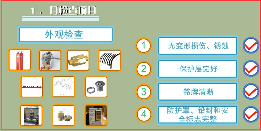 ①滅火劑儲存容器及容器閥、單向閥、連接管、集流管、安全泄放裝置、選擇閥、閥驅(qū)動裝置、噴嘴、信號反饋裝置、檢漏裝置、減壓裝置等全部系統(tǒng)組件應無碰撞變形及其他機械性損傷,表面應無銹蝕,保護涂層應完好,銘牌和保護對象標志牌應清晰,手動操作裝置的防護罩、鉛封和安全標志應完整;