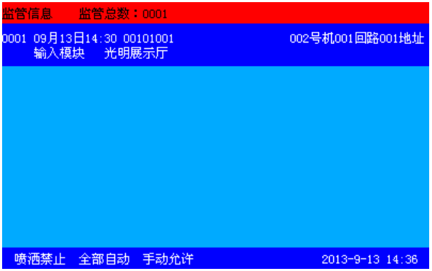 本控制器可在總線上連接輸入模塊,可通過總線部件設(shè)置成監(jiān)管模式。當(dāng)發(fā)生監(jiān)管報警后控制器將進入監(jiān)管報警信息顯示(如圖3-5所示),同時監(jiān)管指示燈常亮。