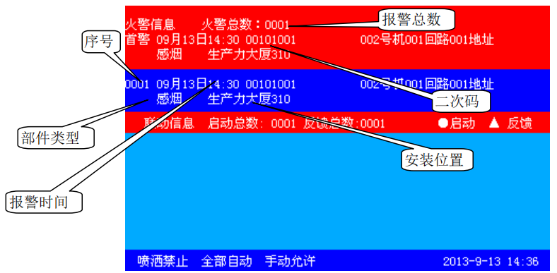 控制器經(jīng)確認后進入火災(zāi)報警狀態(tài)并發(fā)出火警聲、光警報。此時面板上紅色火警指示燈常亮,液晶屏上顯示火警序號、火警總數(shù)、首警部位、報警部件的編碼及類型、報警時間、安裝位置等信息(詳見圖上半屏顯示),同時打印機、歷史記錄記錄相關(guān)火警信息。當(dāng)火警數(shù)量超過兩條顯示時,除首警外,其余報警可自動循環(huán)顯示,按鍵盤上的“▲”、“▼”鍵也可手動查詢。