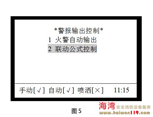 “警報輸出控制”是指對控制器的警報輸出接口進行設(shè)置,可以設(shè)置為火警自動輸出及聯(lián)動公式控制方式。